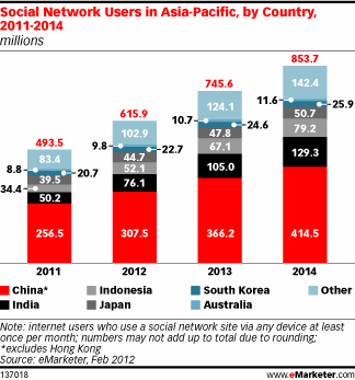 China accounts for the bulk of users in the region, estimated to reach 307.5 million in 2012.