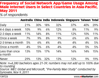 For service providers and marketers, young, professional men in the region are a highly desirable target. According to the November 2011 press release from Microsoft and MEC Global for their “Asia-Pacific Pre-Family Man Study,” men are avid users of social networks and increasingly using them for work, connecting with friends, and for entertainment, as their lives become focused on their career and earning money.