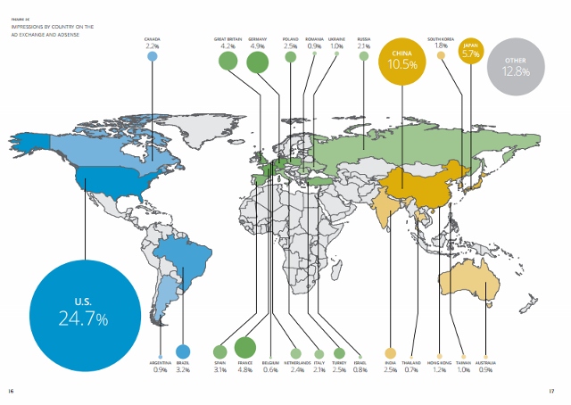 This global map calls out the 2011 impression contributions of the top 25 publisher countries on DoubleClick ad exchange and Google adsense.