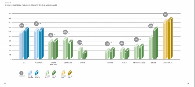 We observe that in many countries—including the U.S., Great Britain, and France—CPM grew over Q3-Q4. In some EMEA markets, notably Spain and Italy, CPMs fell significantly in the fourth quarter, but this seems to correspond with the overall slowdown in advertising spend in late 2011. Germany also experienced a change in inventory that produced an atypical decline that was restricted to this quarter. In conjunction, we observed that reserved inventory sales nearly matched unreserved sales in EMEA over Q3 and Q4, indicating a higher sell-through rate of premium-priced inventory.