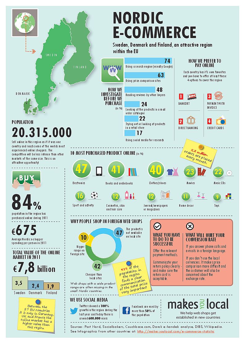 On the one hand, e-commerce in the Nordics is booming and slated to account for almost €11bn in revenues per year, the 4th largest in the EU! More than eight in ten Nordic consumers shopped online at least once last year, each spending an average of €675 per annum. Here's a great infographic illustrating this: