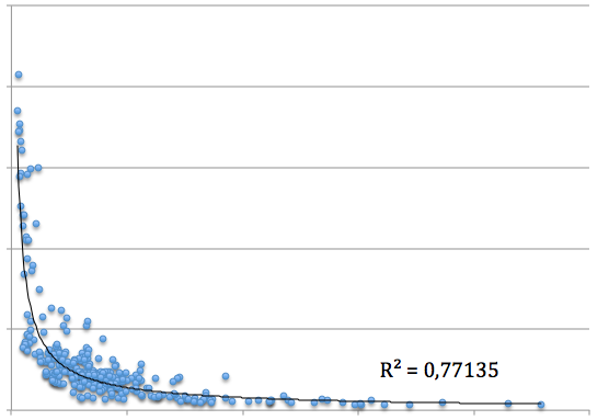 If you are even slightly familiar with statistics, then you probably just thought, “wow, there’s a pretty strong connection!” -- and that’s right. When looking at this kind of data, it is quite rare that it gets clearer than this. The R² value is a whopping 0.77. An R² value of -1 or 1 means that there is a perfect connection between the two variables, 0 means that there is no connection at all. 0.77 means that 77% of the eCPM values can be explained by the number of impressions per advertiser per week.