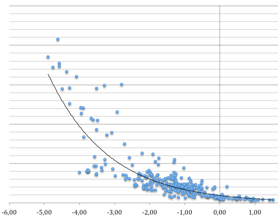 In the chart below I have used the same data as above but transformed the X-axis using logarithmic scale with 2 as base. In a non-mathematical language that translates to moving one step (like from -3 to -4) left on the scale means doubling the amount of advertisers competing per impression.