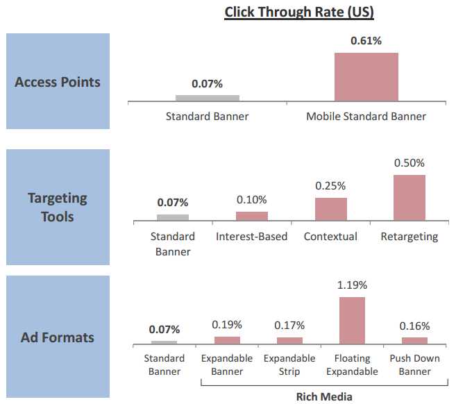 Studies have shown that display ads have a much higher CTR on alternative devices like mobile phones or tablets. These devices are gaining a lot of traction from users at the moment, but will it be enough to sustain global CTR? New ad technology enables advertisers to better target their audience which ultimately leads to higher CTRs. Rich Media ads outperform standard banners with higher CTR and engagement rates and don’t force the user to leave the site.
