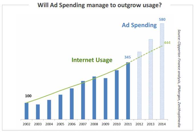 In 2011, two billion individuals used the internet on a regular basis, representing a 30% global online penetration. The increasingly ubiquitous nature of the internet supports the growth in time spent online by each individual. Internet usage seems to be growing at the same pace as online ad spend, however page-views are a far too rudimentary metric to gauge internet advertising potential.