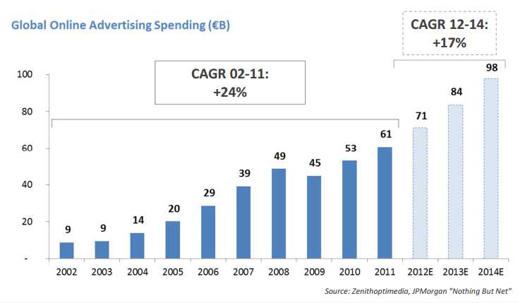 Online advertising spend has grown by a factor of seven between 2002 and 2011; forecasts predict double-digit growth in online ad expenditure, reaching close to $100bn in 2014. The leading segment in online advertising remains Search (~60% vs. ~40% for display), a segment dominated by Google. Analysts expect the current split between search and display to remain constant until 2014.