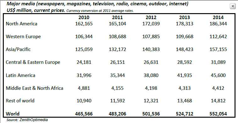 ZenithOptimedia predicts global ad expenditure will grow 4.6% in 2013, reaching US$525bn by the end of the year. As has been the case since the economic downturn began in 2007, this growth will be led by developing markets, which they forecast to grow by 8% on average in 2013; expecting Central and Eastern Europe to bounce back after a tough 2012 with 7.4% growth in 2013, while Asia Pacific (excluding Japan) grows by 8.2%, and Latin America grows by 10.1%.