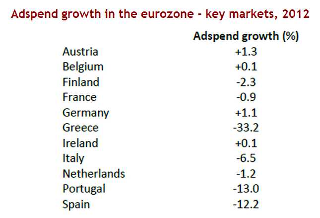 The European Central Bank’s plan to buy bonds as necessary to reduce the borrowing for member countries has bought some time, but the EU needs to put a long-term solution in place before the crisis can be declared over. ZenithOptimedia’s forecasts assume that the eurozone avoids economic disaster (such as a break-up of the euro) this year, followed by slow but steady economic improvement. On this basis ZO predicts eurozone ad spend will grow 0.9% in 2013 and 2.3% in 2014.