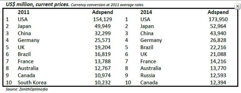ZenithOptimedia predicts Brazil will overtake the UK to become the fifth largest ad market in 2013, and in 2014, Russia will overtake Canada to become the ninth largest. China is already third largest and is steadily approaching Japan.
