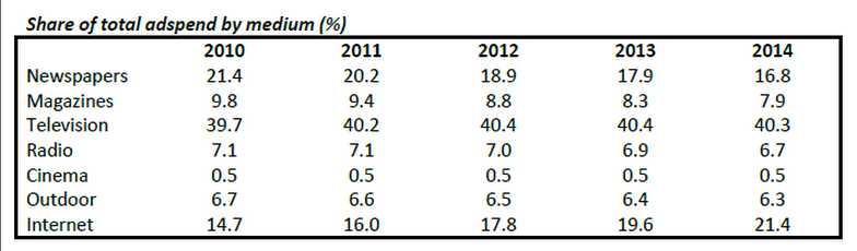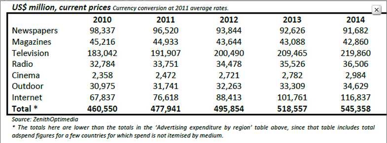 The internet is also the biggest contributor of new ad dollars to the global market. Between 2011 and 2014, ZO expects internet advertising to account for 60% of the growth in total expenditure. The next biggest is television, which they forecast to contribute 41% of growth. (The two add up to more than 100% because newspapers and magazines are subtracting from total growth.)