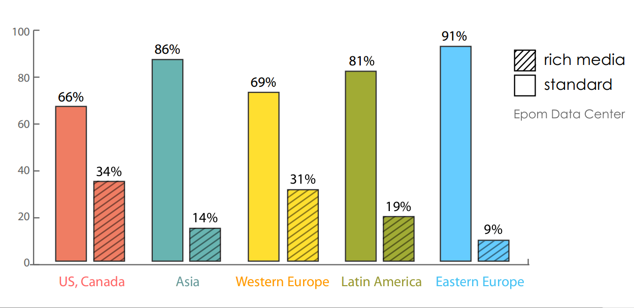 As for the improvement of ad interactivity and effectiveness, rich media will continuously get more and more popular, though the saturation of use, according to Epom Data Center, turns out differently in various parts of the world. In particular, whereas the largest number of rich media in-app ads is seen in America, more standard banners are still being applied in Asia and Eastern European countries. In particular, in the latter case, the percentage of rich media ads has only reached 9% of the market, for now. Nonetheless, their share of the market is likely to increase in the upcoming years, so the region will be worthy of working with.