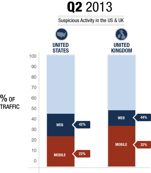 A geographic analysis revealed that China, Venezuela and Ukraine had the highest levels of suspicious activity in the display category and Singapore, Macau and Qatar had the highest levels of suspicious activity in mobile. In the US, suspicious web activity reached 43% and suspicious mobile activity reached 22%. In the UK, suspicious web activity reached 44% and suspicious mobile activity hit 32%.