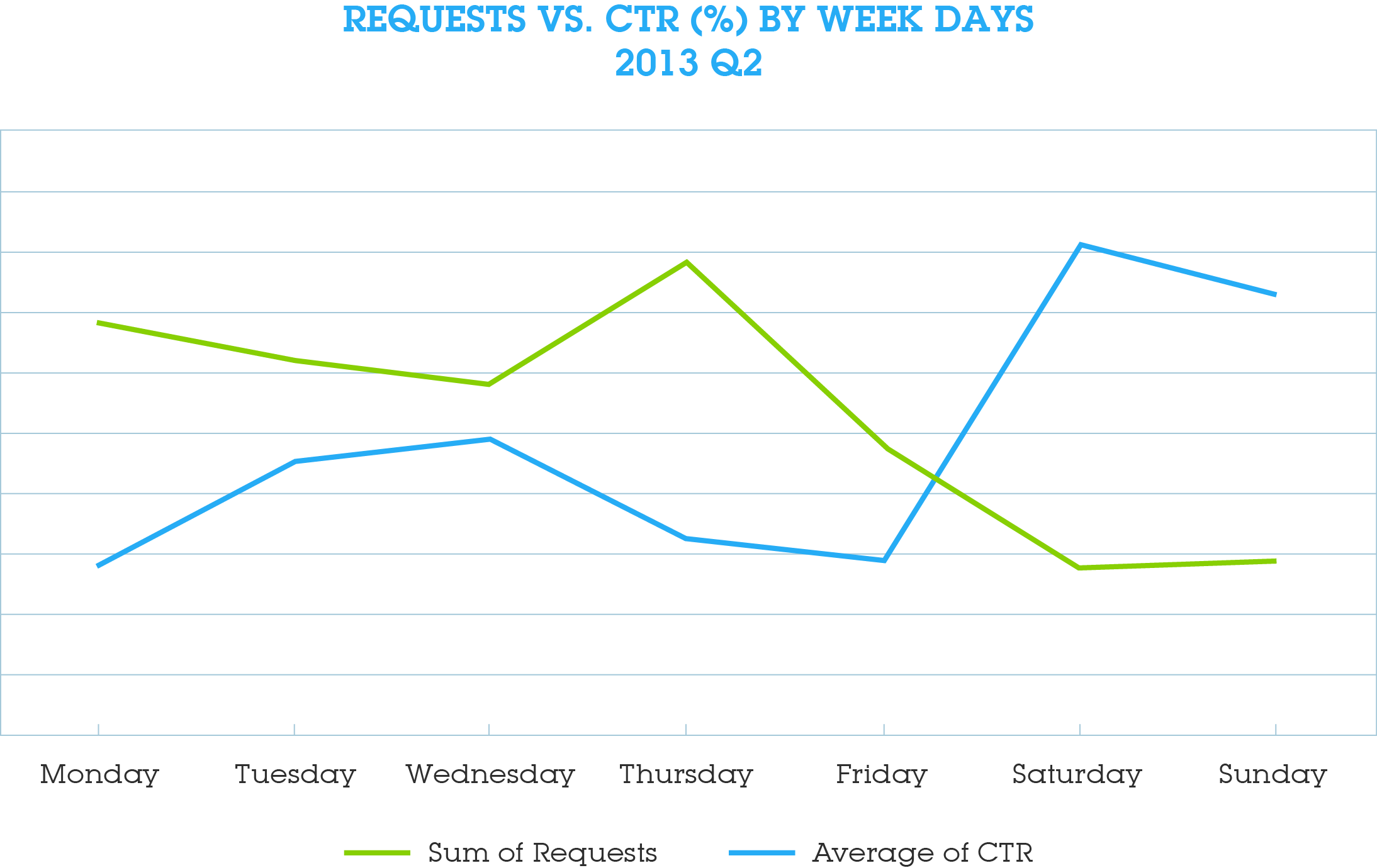 Finally, weekends are proving to be ideal times for marketers to reach and engage consumers. CTR increases on Saturday and Sunday, while the number of bid requests decline. The result is a more receptive audience available at a lower cost. Perhaps it’s time for brands to reconsider how they split their media across the days of the week.