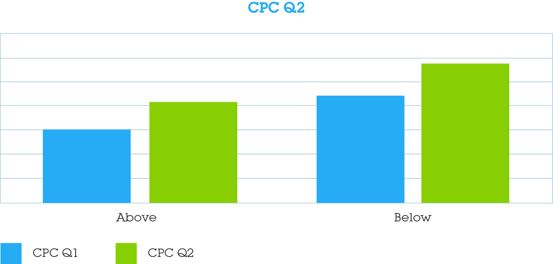 The CTR for banners above-the-fold declined slightly from Q1 to Q2, while the CTR for banners below-the-fold saw a modest increase. Meanwhile, the difference in CPMs narrowed 6% from Q1 to Q2. These trends would appear to indicate that banners below-the-fold are beginning to catch up to those above-the-fold in terms of value delivered, however, the substantial difference in cost-per-click (CPC) proves otherwise. The CPC for banners below-the-fold jumped by 76% from Q1 to Q2, and are 70% higher than those above-the-fold.