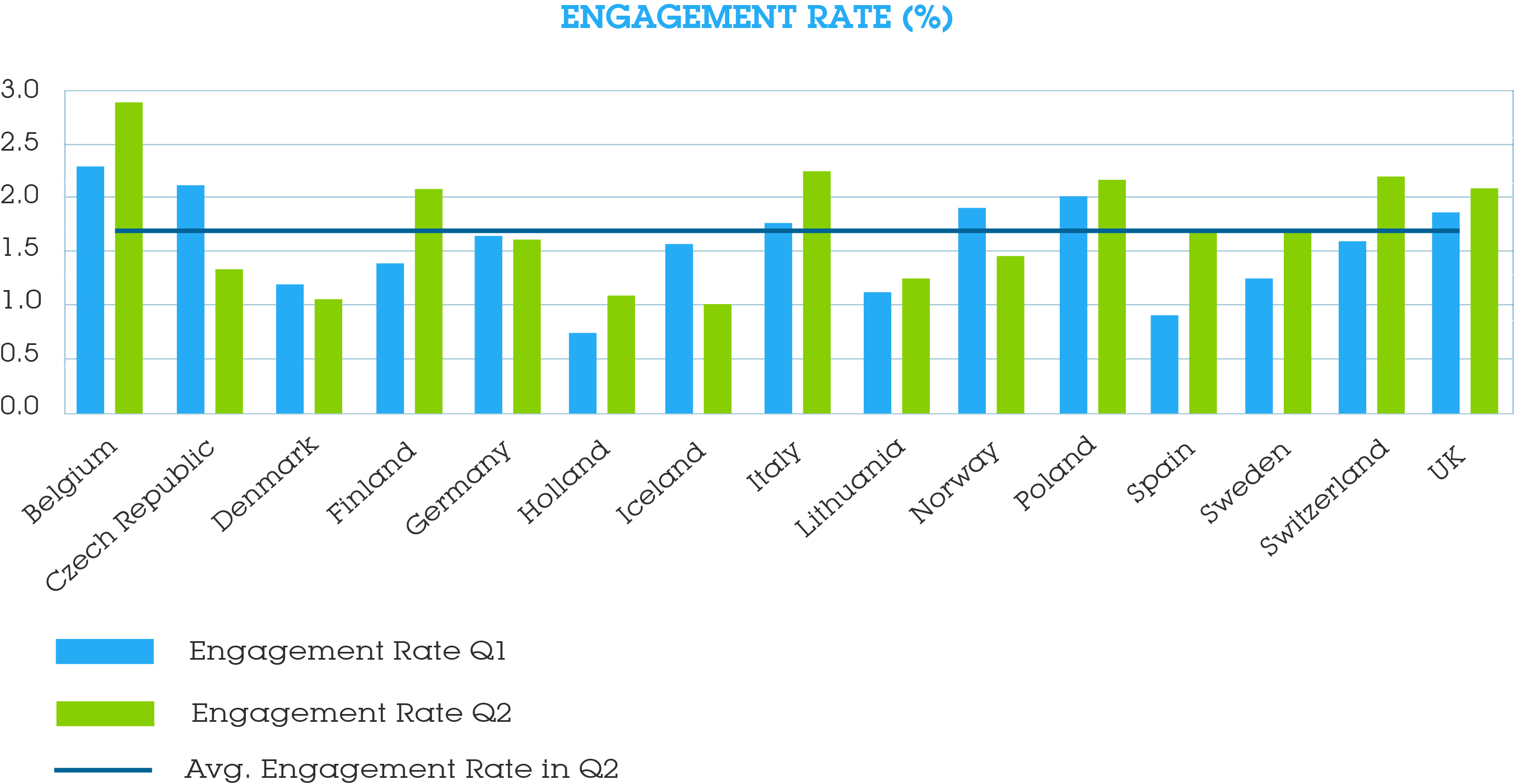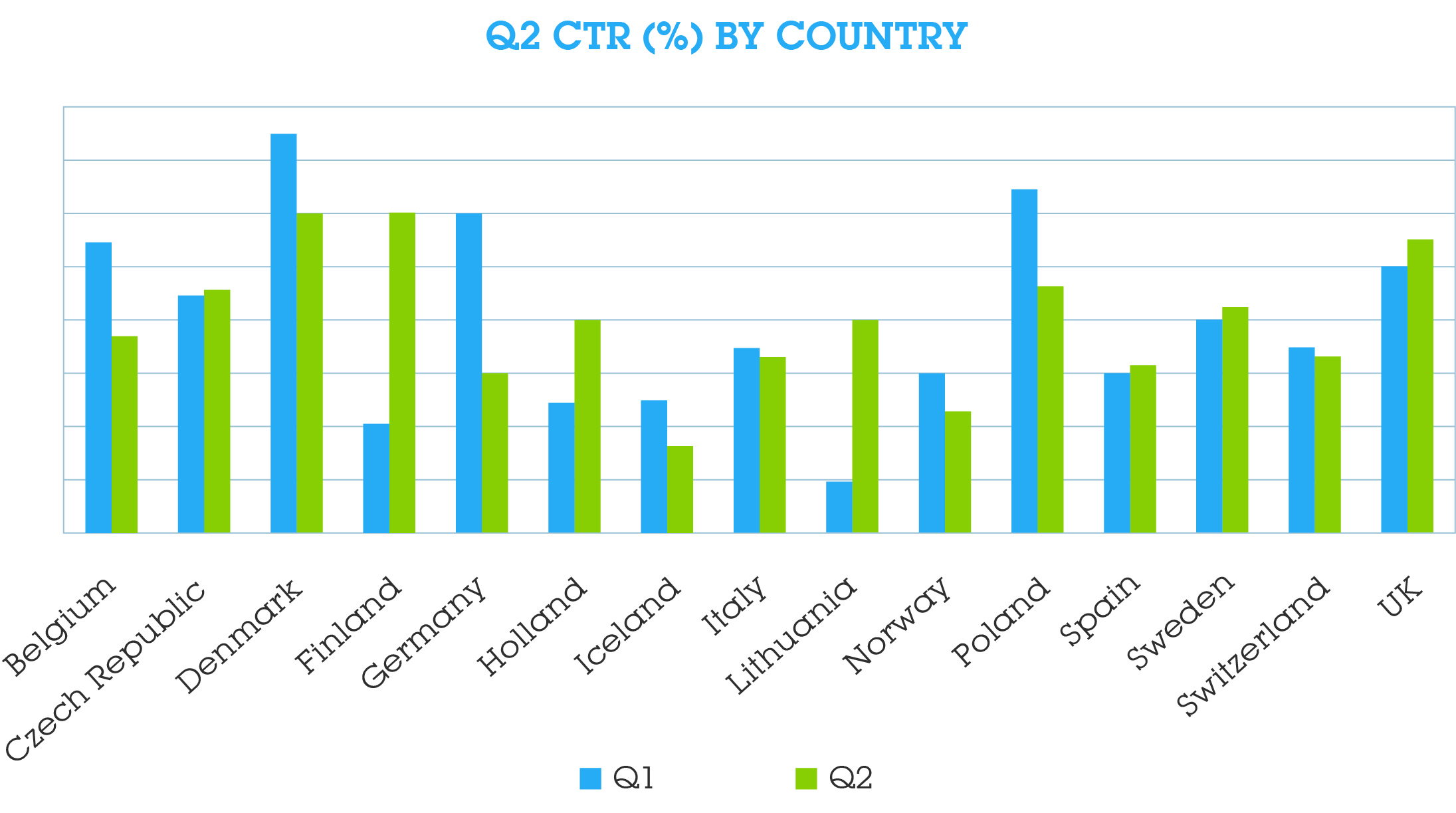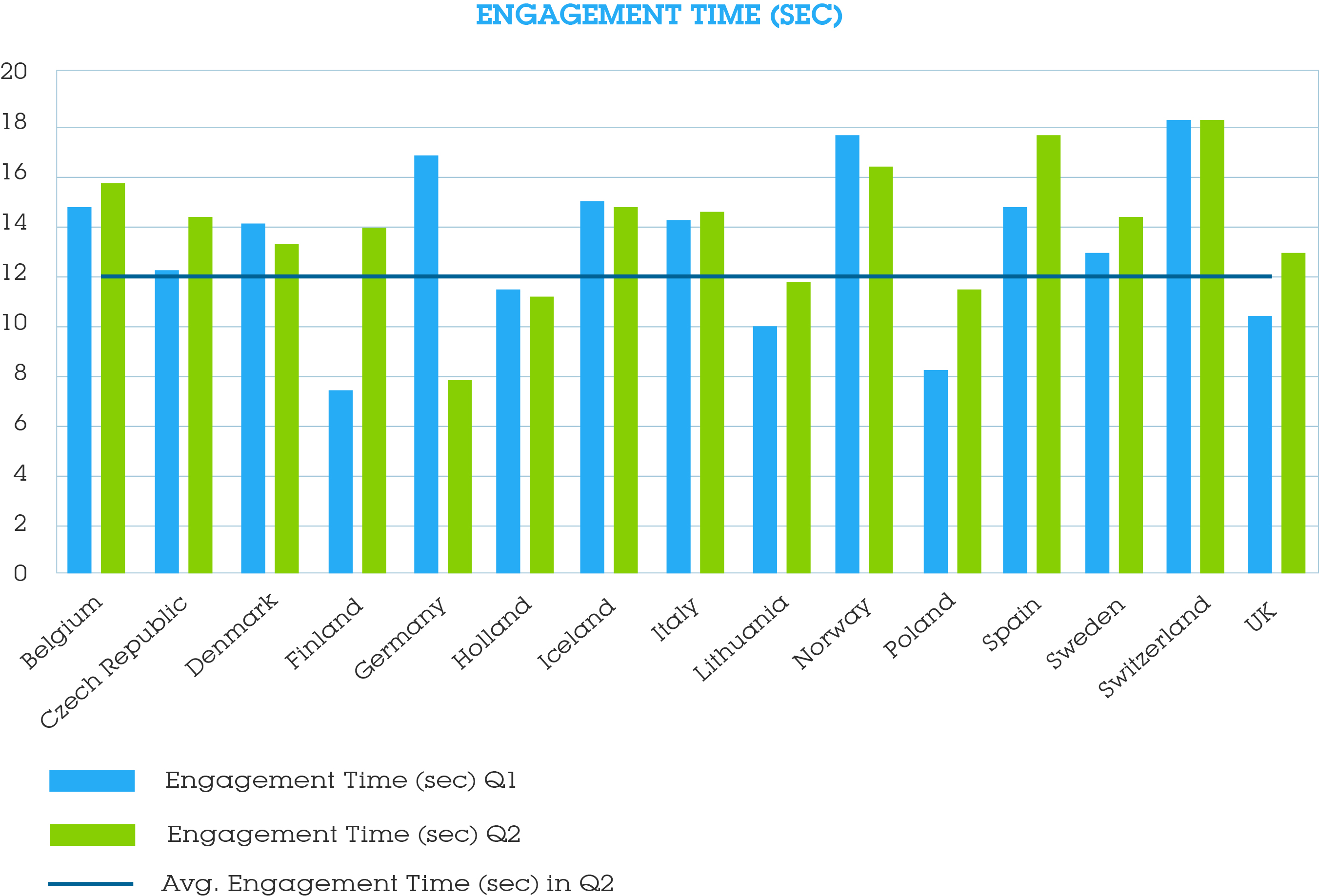 On the flip side, engagement rate across Europe is up 14%, which is good news for brand campaigns. Engagement time saw little change from Q1 to Q2; however, the 12-second average is extremely high, and a clear indication that users are truly engaged with an ad.