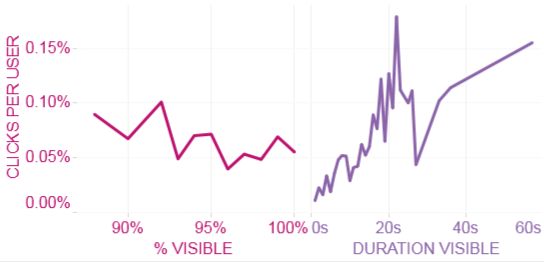 When we began to optimise this campaign we found that achieving a high duration of viewability was less of a challenge than increasing the percentage of the banner seen. However, interestingly, as seen in the diagram below, the length of exposure to a message was the more fundamental engagement lever. We noticed no increase in clicks-per-users above 88% of banner area seen, but there was a direct correlation between viewable duration and interaction rate.