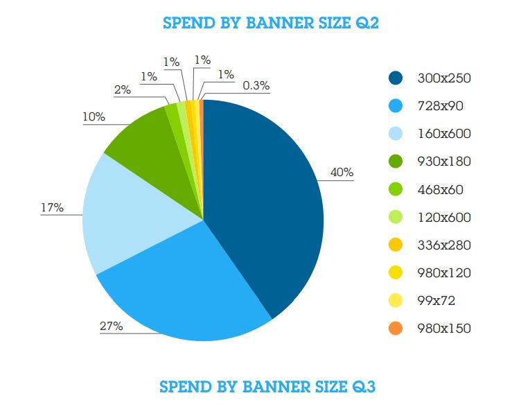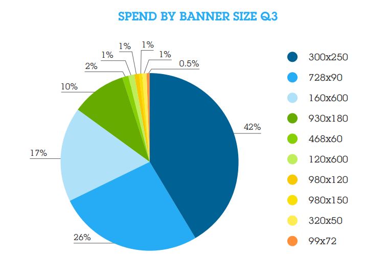 The most popular banner is still the rectangular 320x250 (article), which saw a 2% spend increase in Q3. Given the massive volume of units traded, a 2% bump is significant. A possible reason may be that 320x250 is now used for mobile ads as well as display (mobile buying increased significantly as we report in the next sections).