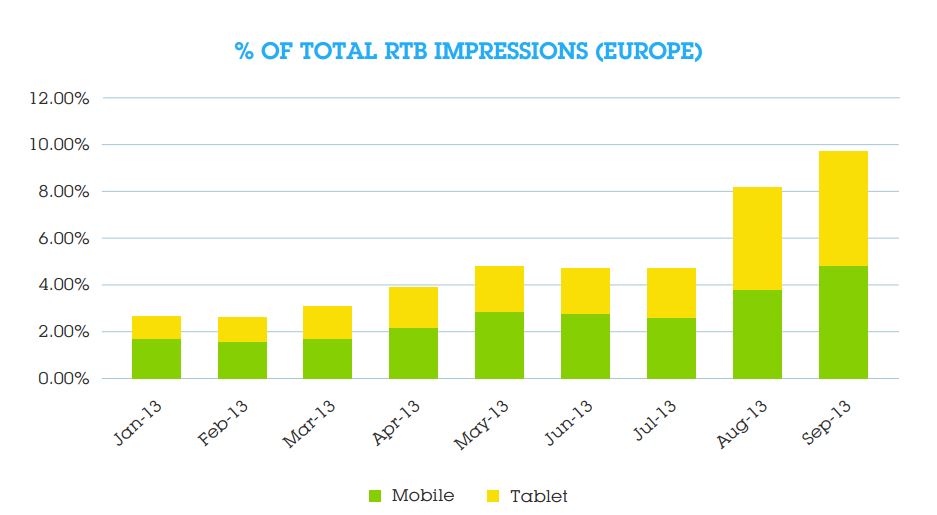 Mobile impressions are becoming more abundant in the RTB markets, growing by 43% from Q2 to Q3, while tablet impressions grew by an astonishing 102%.