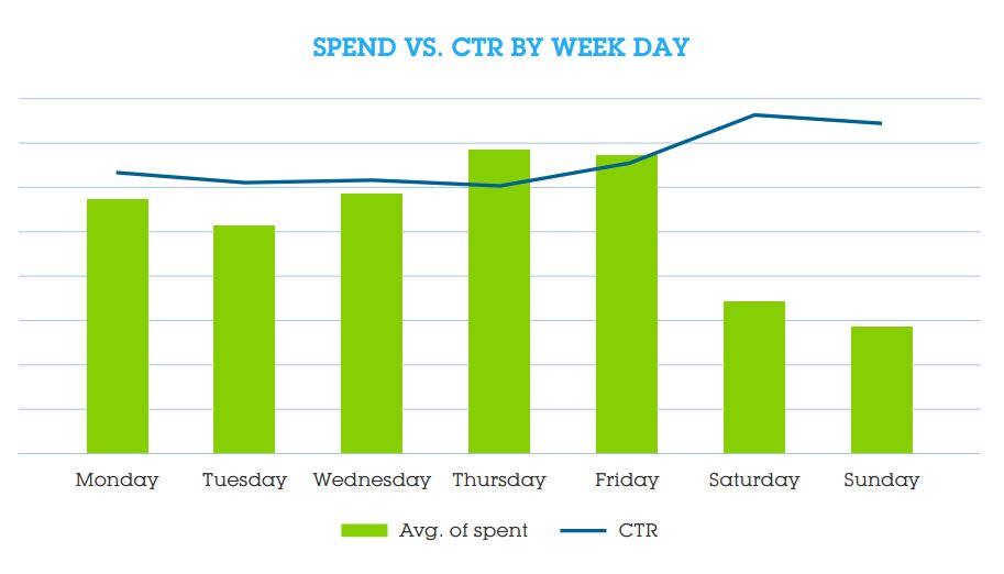 Spend in the RTB markets drop at the weekend, though CTRs are at their all-time highest for the week. At the same time, CPMs for weekend inventory dropped by 50%.