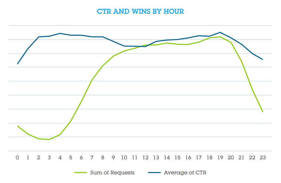 Looking deeper into this phenomenon, we compared CTRs to requests (i.e. the number of times a publisher sends a request for an ad to retail market) by weekday. We’ve found that the number of requests begins to decline on Thursdays – at almost the exact same time that CTRs begin their climb up. Saturday mornings see the widest gaps between requests for ads and CTR.
