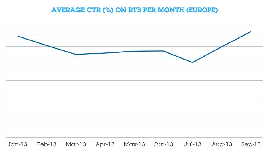 European CTRs mirrored the summer holidays, reaching its lowest point in July before climbing back up to January 2013 rates. On the whole, CTR in Europe is remarkably stable, enabling marketers to design campaigns around anticipated returns.