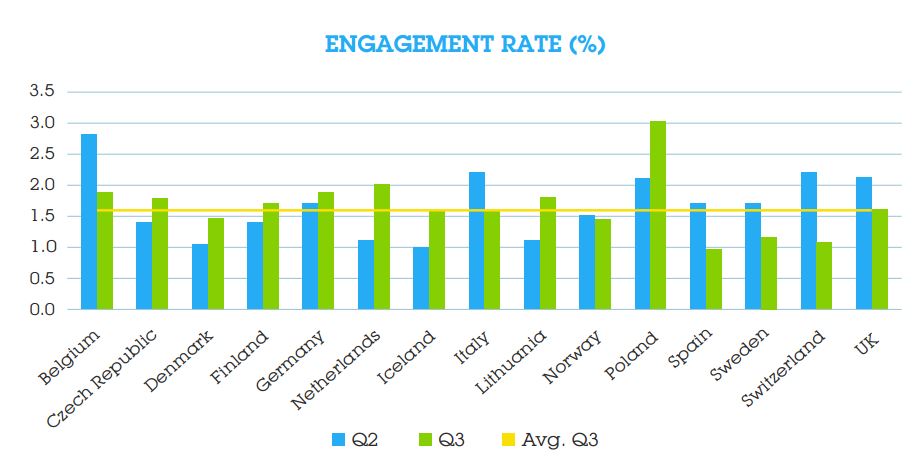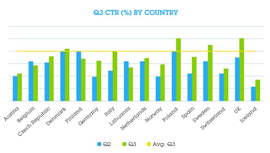 European CTRs rebounded in Q3, after sharp declines in the first half of the year. The increased clicks may be the result of an abundance of retargeting campaigns. In general, CTRs are showing signs of stabilisation.