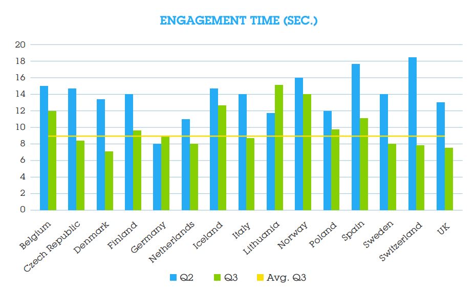 Engagement time decreased from 12 seconds in Q2 to 9 seconds in Q3. This decline may be a result of summer shopping retargeting campaigns that rely on images rather than video.