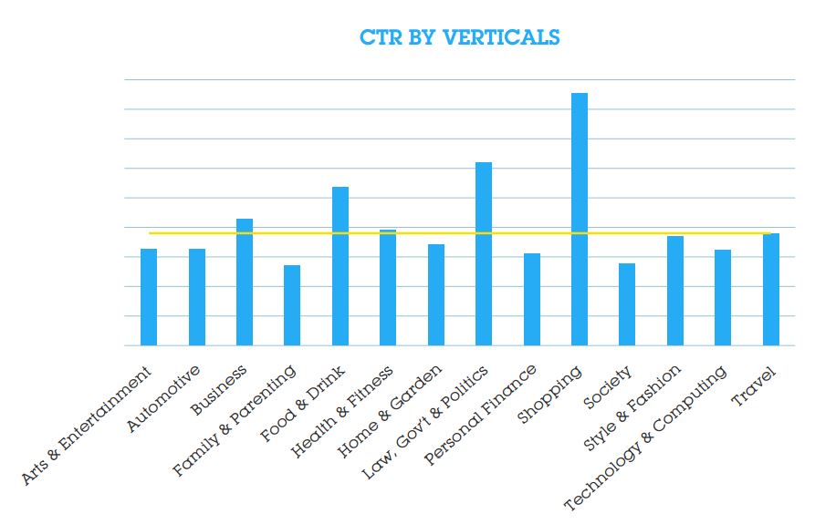 Looking at performance by verticals, the shopping category by far earns the highest CTR%, possibly as a result of numerous RTB-executed retargeting campaigns.