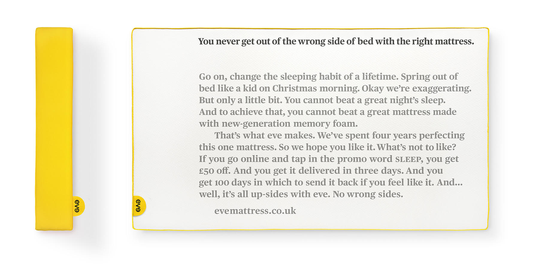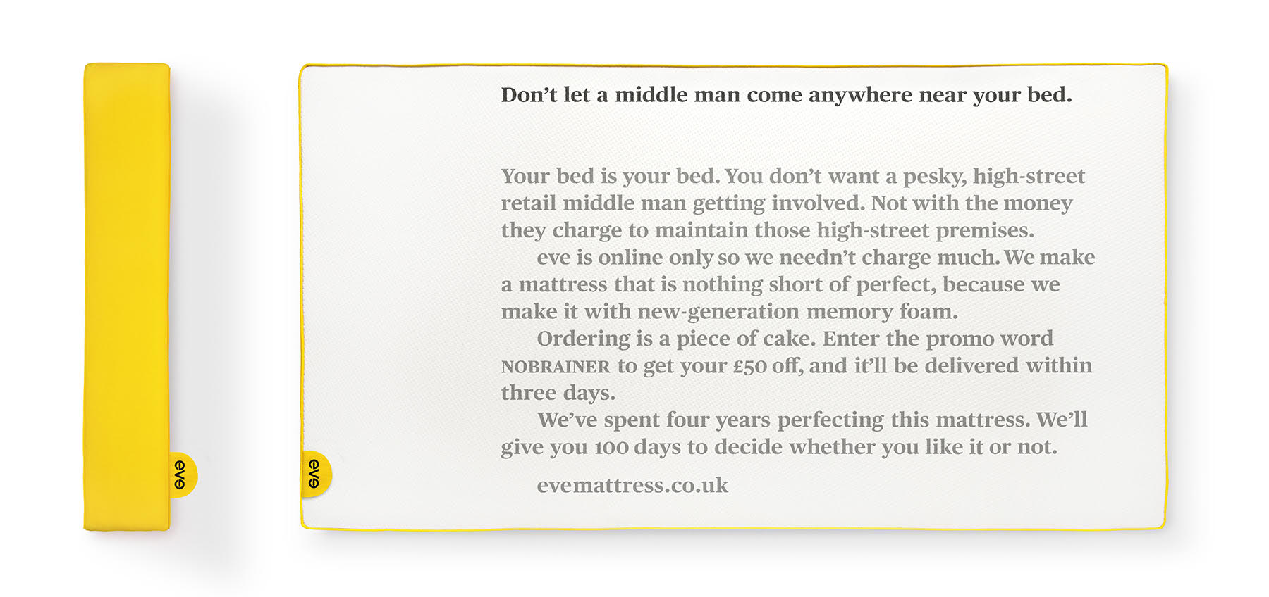 In 2014, traditional mattress companies’ adverts were “light on detail, often focussed on the idea of a good night’s sleep”. When Wieczorek first started sketching ads, his creative vision followed a similar path – he focussed on brand messaging and imagery (see left).