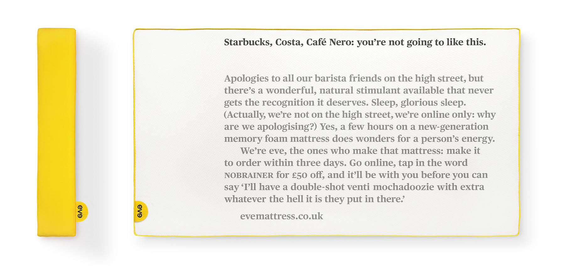 These simple, elegant ads were deployed in online advertising campaigns. Eve Sleep noticed that each digital channel they tried “worked well for three months or so and then performance would start to decline and [they] would kick off a new channel”.