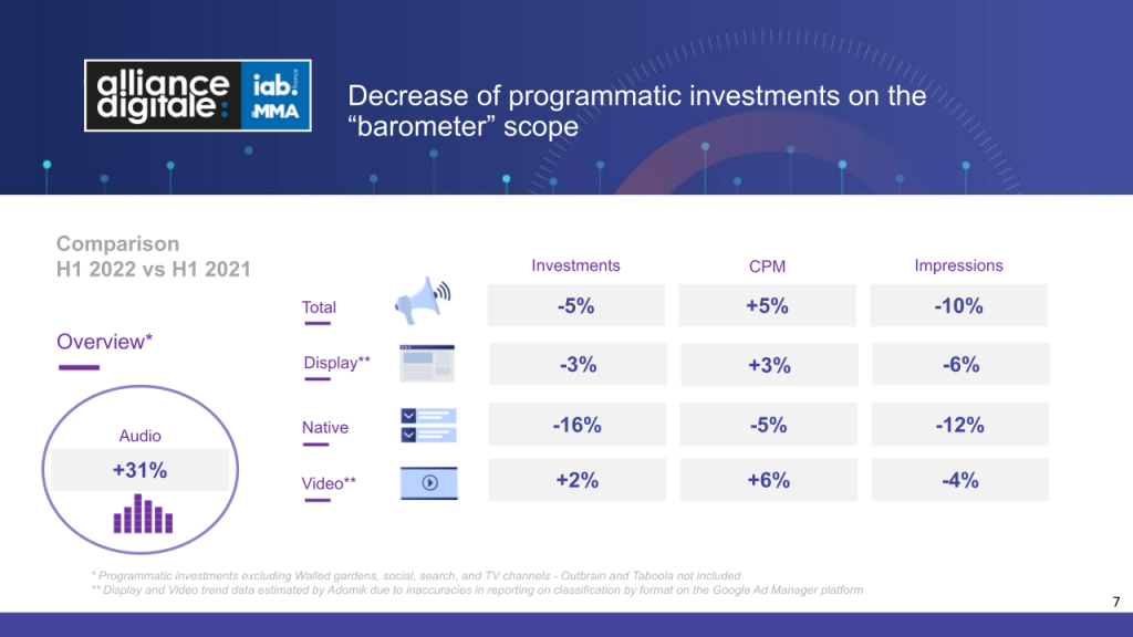 - With a net slowdown in investments from April 2022, programmatic advertising is caught up in a difficult economic context and dropped 5% compared to H1 2021. While the Observatoire de l’e-pub indicates that the global digital advertising market is still growing sharply (+19%), French publishers seem to be strongly impacted by the reduction in programmatic advertising budgets since June 2022.